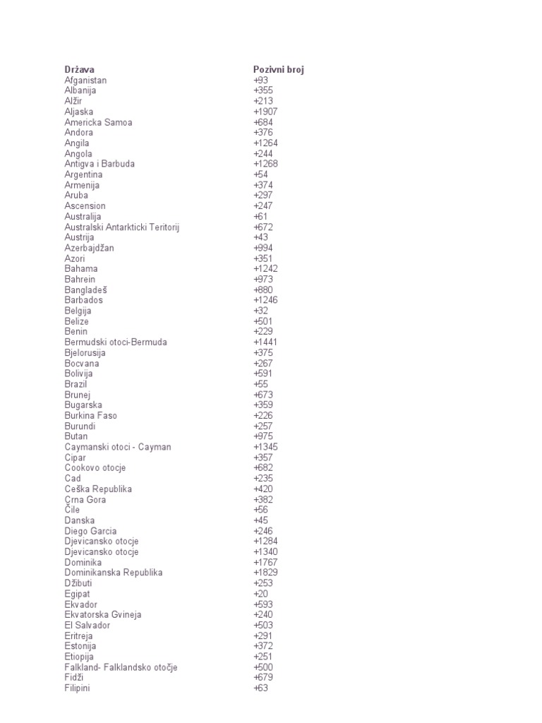 Pozivni Telefonski Brojevi Drzava