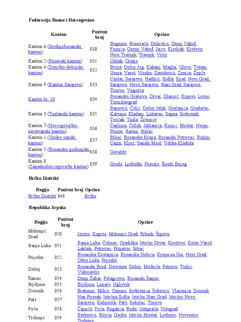 Telefonski Pozivni Brojevi U Bosni I Hercegovini Sveznan